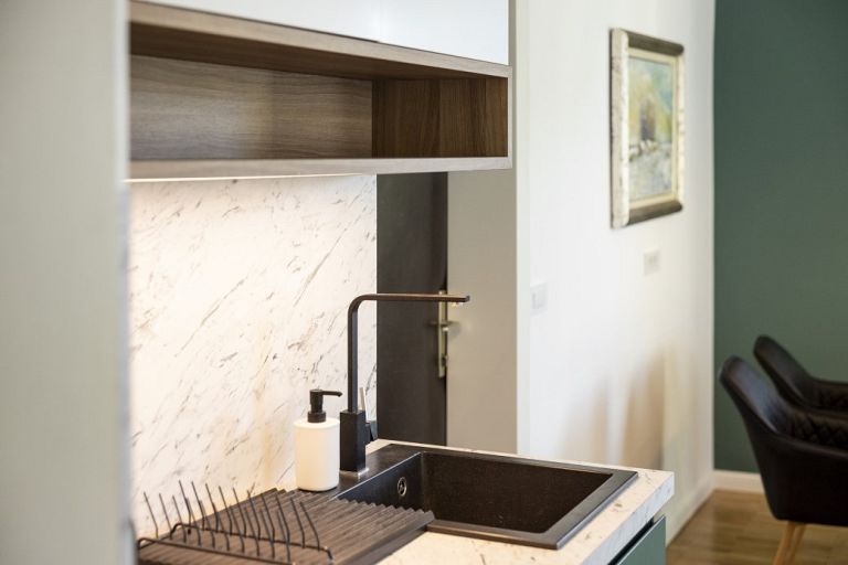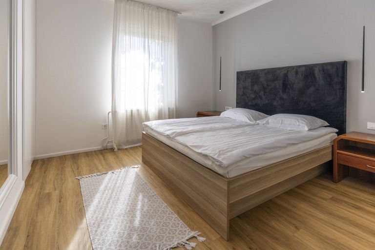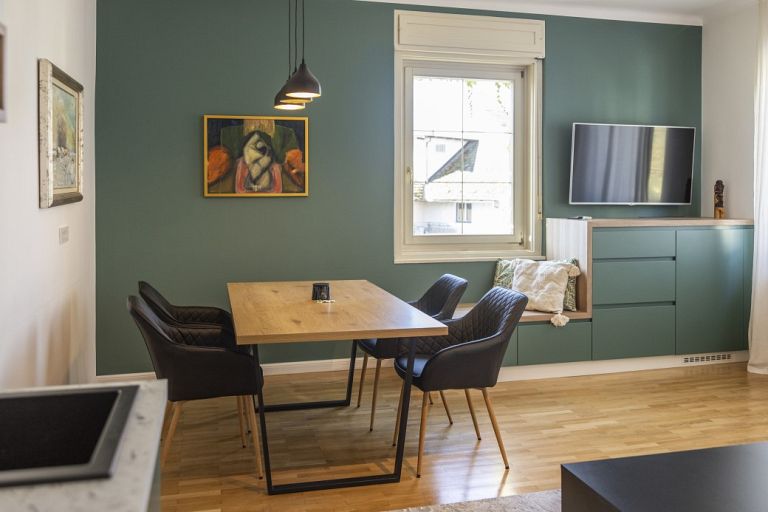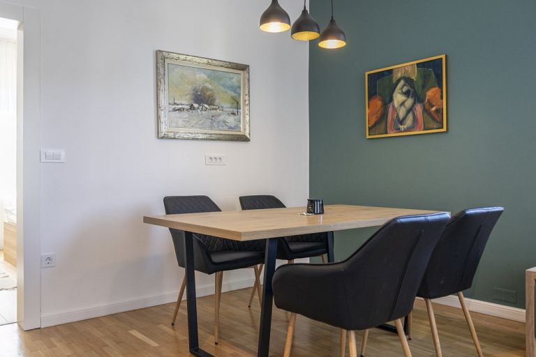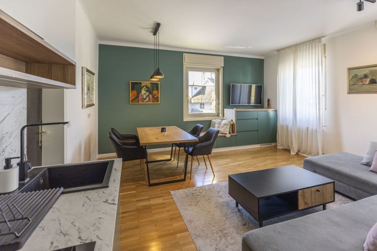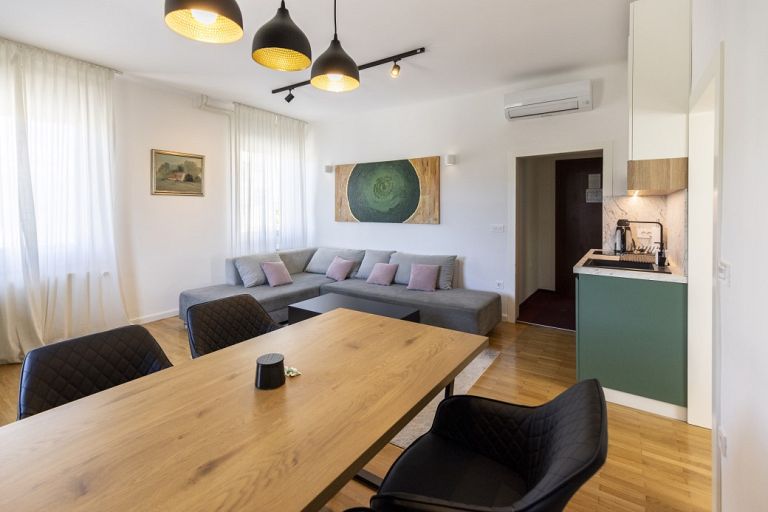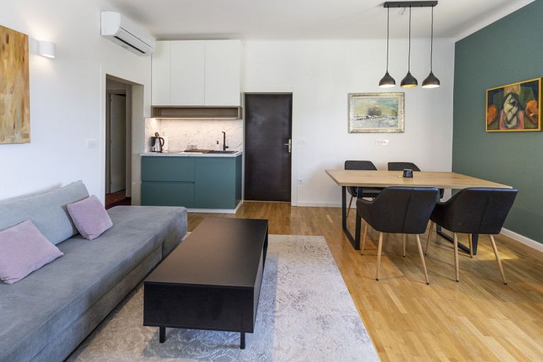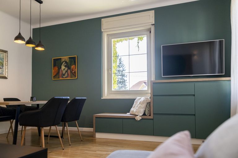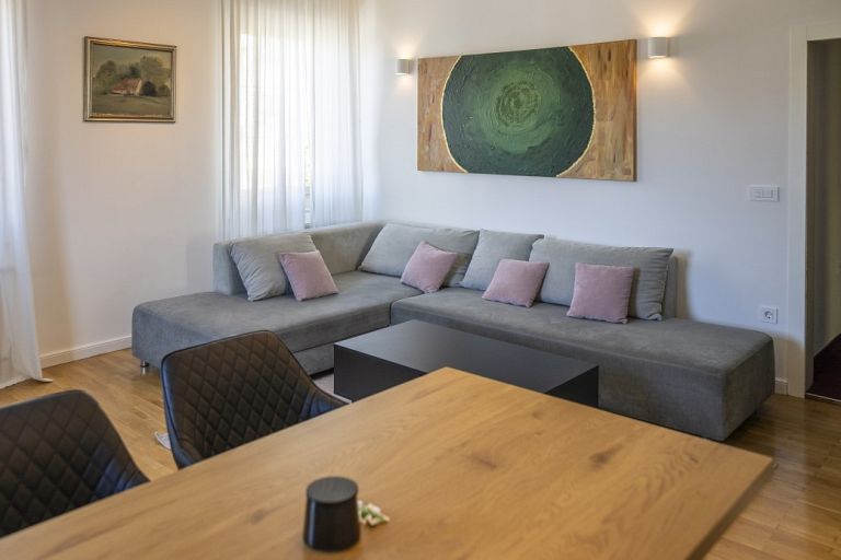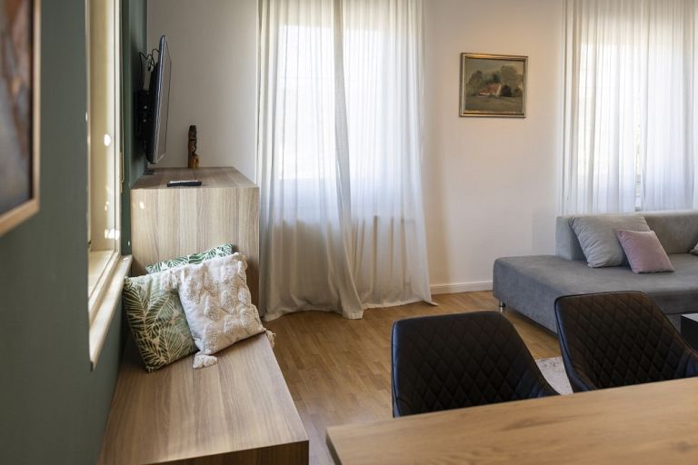 Apartma Šporn je prostoren in sodobno opremljen. Je klimatiziran, ima LCD televizor, telefon, brezplačno WI-Fi povezavo, kuhinjo, dnevno sobo, kopalnico s tušem, WC, bide in sušilec za lase.